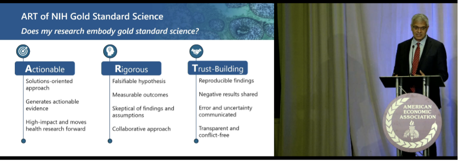 Dr. Bhattacharya outlined what successful NIH-funded health economics should look like. He emphasized three core attributes: